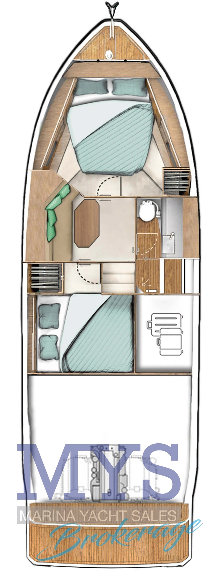 Below deck layout with master cabin forward and separate guest cabin.