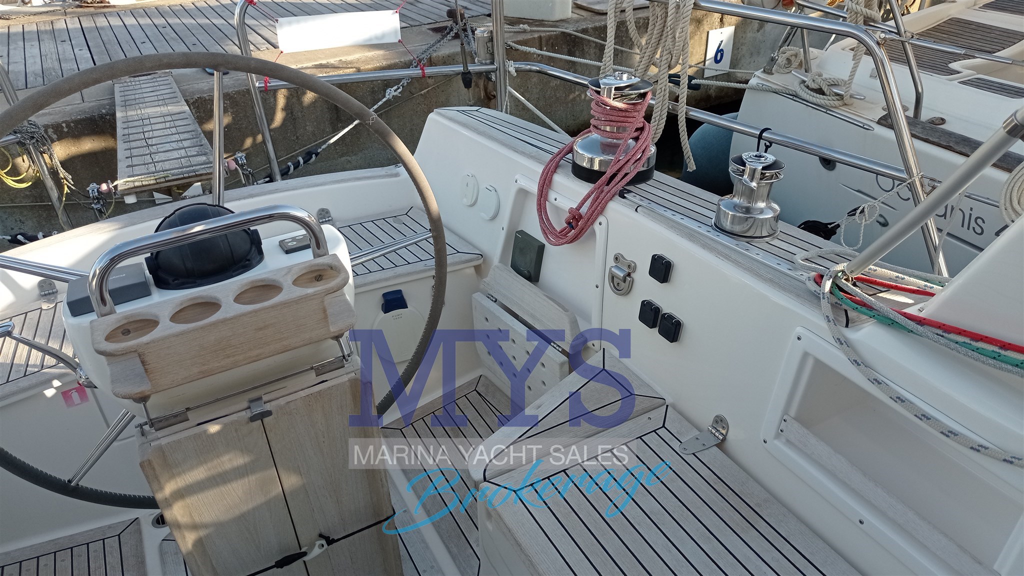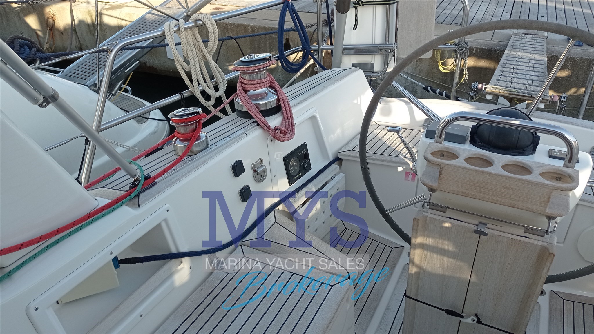 Alarme moteur, Ancre, 4 x Batteries, 4 x Chargeur de batterie, Cockpit en teck, Corne, Douche de cockpit (CALDO/FREDDO), Eau sous pression, Echelle de bain, Éclairage de courtoisie, Extincteur(s) fixe(s), Filières avec sortie latèrale, Guindeau électrique, Passavant en teck, Passerelle, Pompe de cale automatique, Pompe de cale manuelle, Pont en teck, Prise de quai, Répétiteur électronique , table de cockpit, 2 x Winch électrique, Windex.