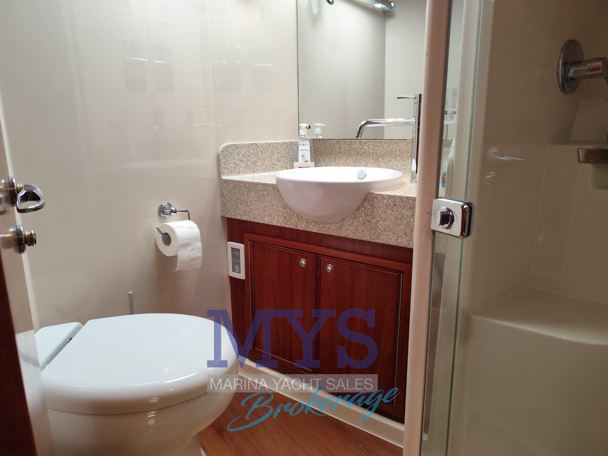 1 Salle de bain avec lavabo, douche et WC marin électrique
