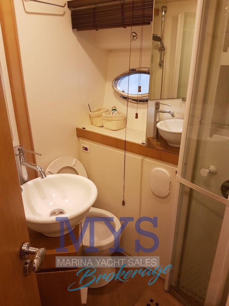 1 cabine double principale au milieu du navire avec salle de bain complète avec lavabo, douche et toilettes marines électriques