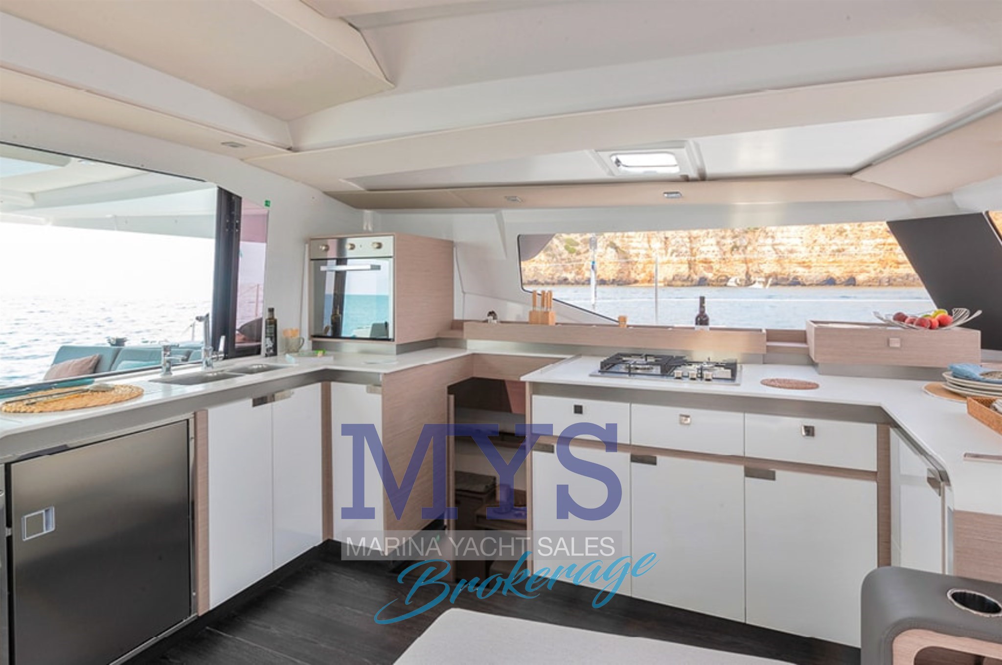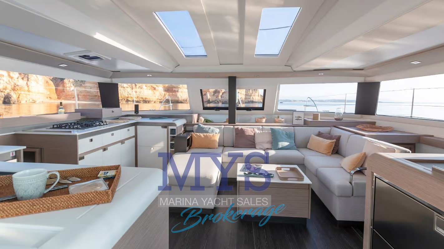 Ampio pozzetto a filo con dinette interna open space, cucina completa e luminosità a 360°. La sensazione è quella di un 50 piedi, con costi di gestione più contenuti.