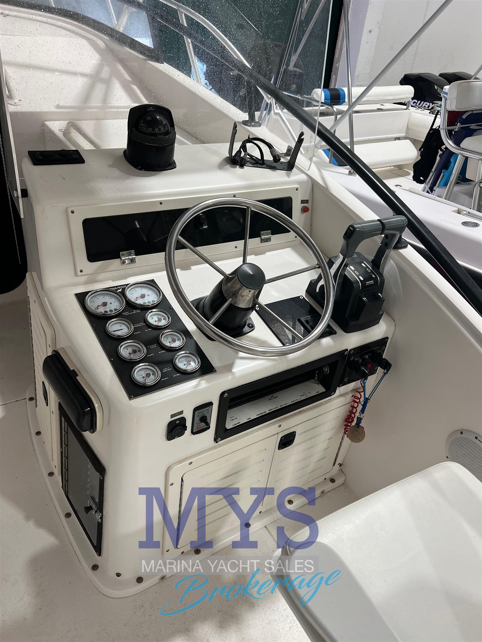 Bussola, Comando motori elettronico, Ecoscandaglio, GPS, Luci di navigazione, Radio VHF.